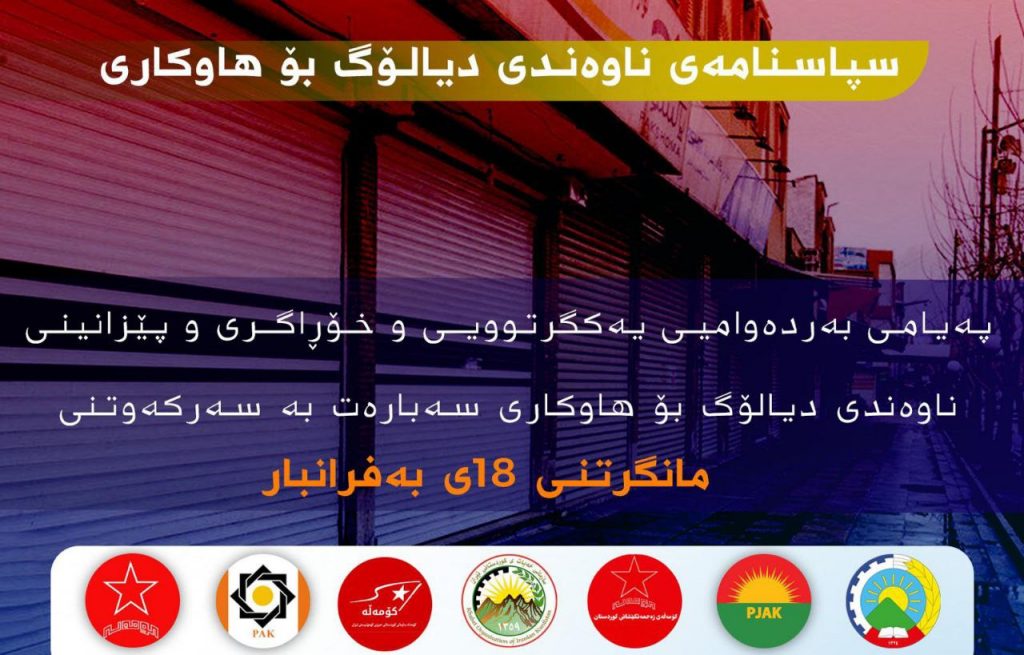 ناوەندی دیالۆگ بۆ هاوكاریی حیزبەکان لە کوردستان سپاسی خەڵکی خەباتکاری کوردستان و ئازادیخوازانی ناوچەکانی تری ئێران دەکا کە بە مانگرتن و بەردەوامیی ناڕەزایەتییەکانیان وەڵام و پەیامێكی سیاسیی ڕوون و گورچكبڕیان بە هێزە سەركوتگەرەكان و تەواوەتیی ڕێژیمی دەسەڵاتدار دایەوە. خەڵکی بوێر و ئازادیخوازی کوردستان نیشانیان دایەوە هەڕەشە و تۆقاندن و سیاسەتی سەرکوت هەنگاویان پێ شل ناکا و بەو یەکڕیزی و یەکگرتووییەی حیزبە سیاسییەکان و خەڵکی کوردستان ئەو پەیامە بە ڕاشکاوی ڕاگەیەندرا کە كە بزووتنەوەی ئازادیخوازانەی ئێمە پێی ناوەتە قۆناغێكی نوێوە. ئەم قۆناغە نوێیەش دەخوازێ لەپێناو بەردەوامی و سەرکەوتنی یەکجارەکیدا زیاتر و جیاوازتر لە هەمیشە بەستێنی لەبار بۆ یەکڕیزی، هاوخەباتی و هەڵمەتی پێكەوەیی دەستەبەر بکەین و بەوەش هێزێكی زیاتر بە خەبات و بزووتنەوەکەمان بدەین.