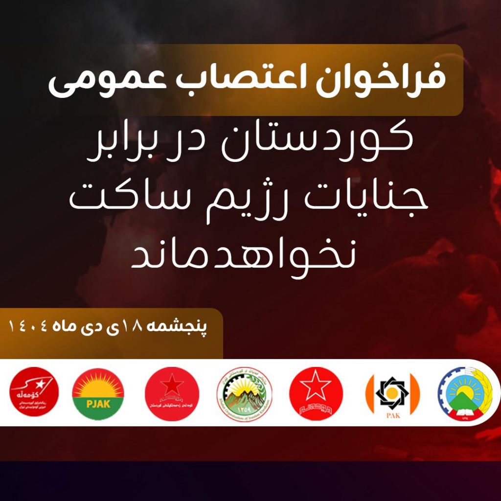 ما سرکوب تظاهرات و بازداشت مردم معترض و حقطلب در ایران و کوردستان، که سیاست همیشگی رژیم جمهوری اسلامی است، را قویاً محکوم میکنیم. بهمنظور حمایت از اعتراضات سراسری و همبستگی با هموطنانمان در کرماشان، ایلام و لرستان، از مردم کوردستان دعوت میکنیم که در روز پنجشنبه، ۱۸ دی ۱۴۰۴، اعتصاب عمومی برگزار کنند.