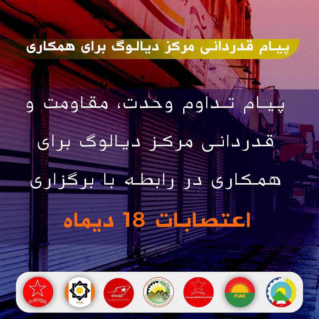 «مرکز گفتگو برای همکاری احزاب کوردستان ایران» از مردم مبارزکوردستان و آزادیخواهان سراسر ایران سپاسگزاری میکند که بااعتصاب و تداوم اعتراضاتشان، پیامی سیاسی، روشن و کوبنده بهنیروهای سرکوبگر و کلیت رژیم حاکم دادند. مردم شجاع و آزادیخواهکوردستان نشان دادند که تهدید و ارعاب و سیاست سرکوب، گامهای آنانرا سست نخواهد کرد و با این یکپارچگی و اتحاد احزاب و مردمکوردستان، پیام روشنی ارسال شد: جنبش آزادیخواهانه ما وارد مرحلهجدیدی شده است.